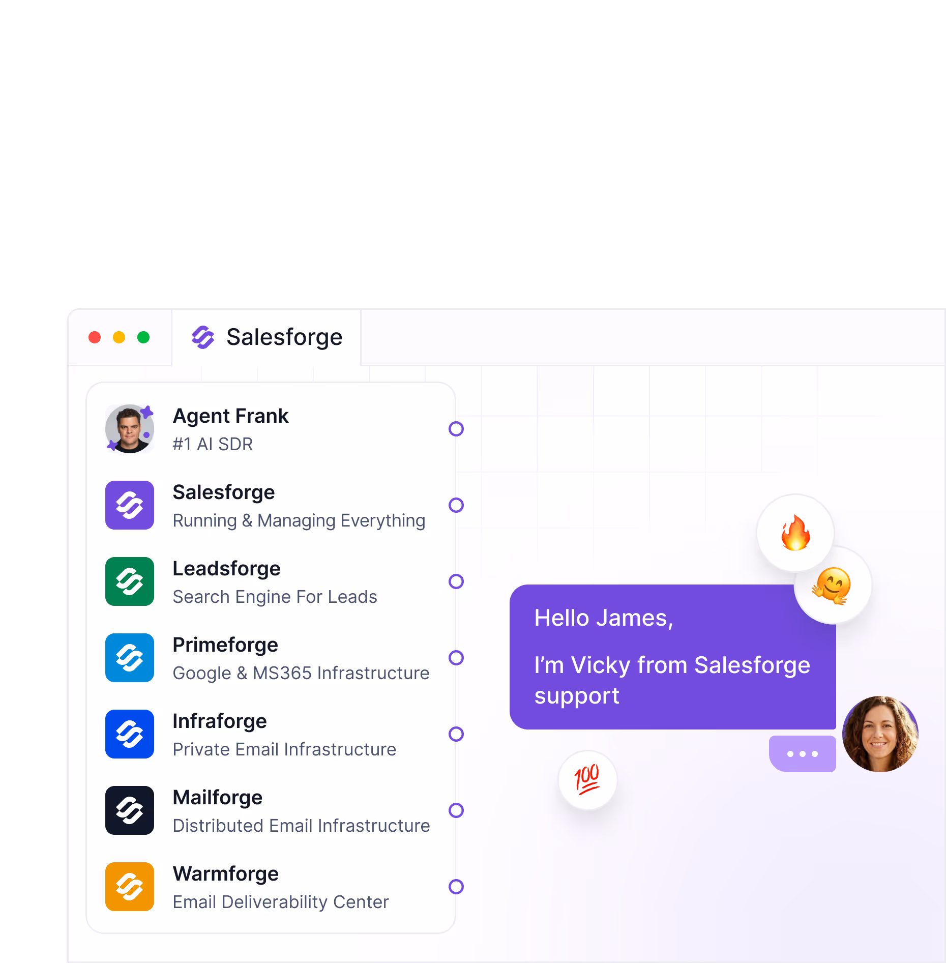 Agent Frank works around the clock and handles the entire SDR workflow from start to finish. Once configured, he taps into every Forge product behind the scenes without requiring any extra setup from you. Frank finds prospects, enriches and verifies their data, crafts authentic outreach, sends follow-ups, manages replies, and books meetings - all automatically. You define his buyer persona, goals, ICP, and operating rules, and he takes over the execution: from outreach to reply handling. Frank gives you a fully autonomous SDR engine that never slows down and never needs a break.
